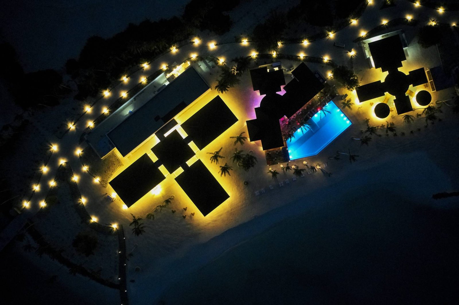 King-size bedrooms with alcoved daybeds, outdoor bathrooms, beachfront terraces with dining areas, and sun loungers.