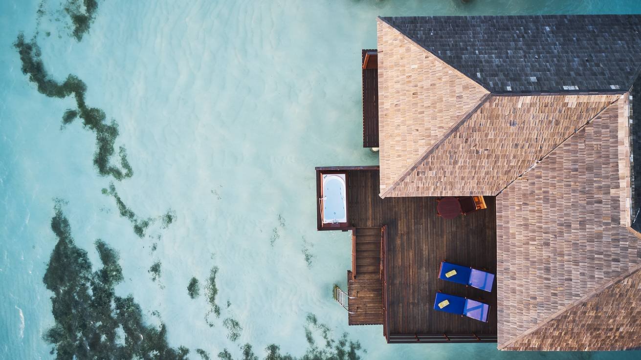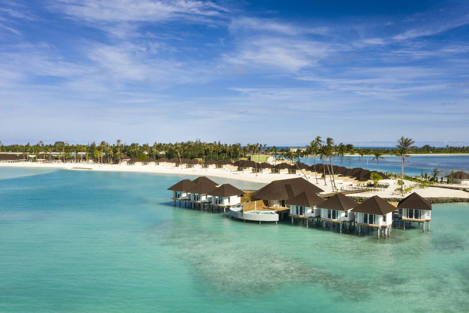 Overwater villas with outdoor jet tubs, steps into the lagoon, king-size beds, and freestanding tubs, offering classic Maldivian luxury.